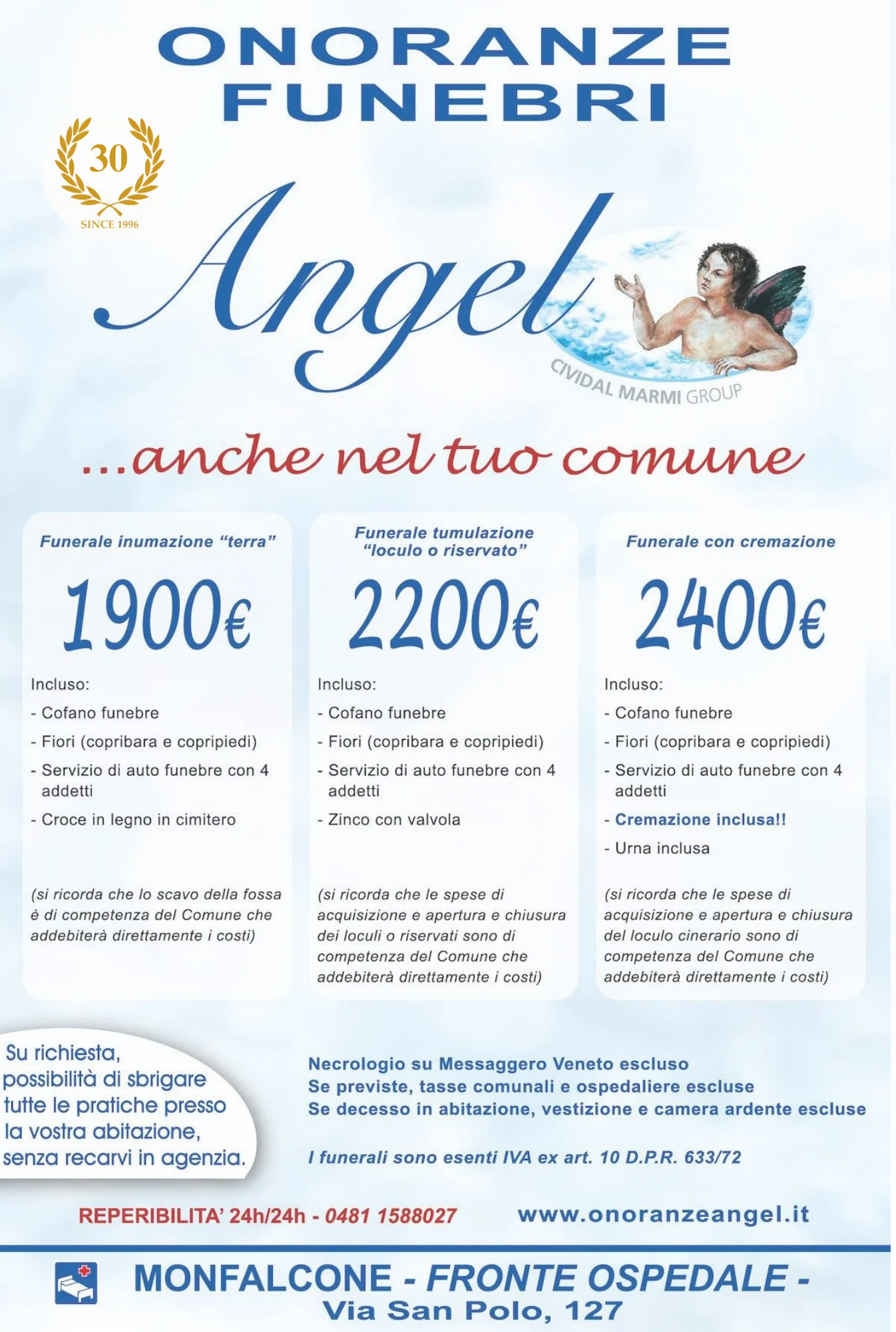 L'impresa Onoranze Funebri Angel offre servizi funebri per venire incontro a tutte le esigenze delle famiglie colpite da un lutto. L'impresa, con sedi a Remanzacco, Pulfero, Feletto Umberto, Tarcento, Monfalcone opera in tutta la provincia di Udine e Gorizia, offre servizi funebri a prezzi competitivi comprensivi dell'organizzazione del funerale completo. Cofano funebre, fiori, disbrigo di tutte le pratiche funerarie e cimiteriali, servizio provvisorio comprensivo di riquadro in granito, ghiaino bianco, targa incisa con fotoceramica, vaso in marmo e croce in legno con crocefisso e cartellino identificativo.